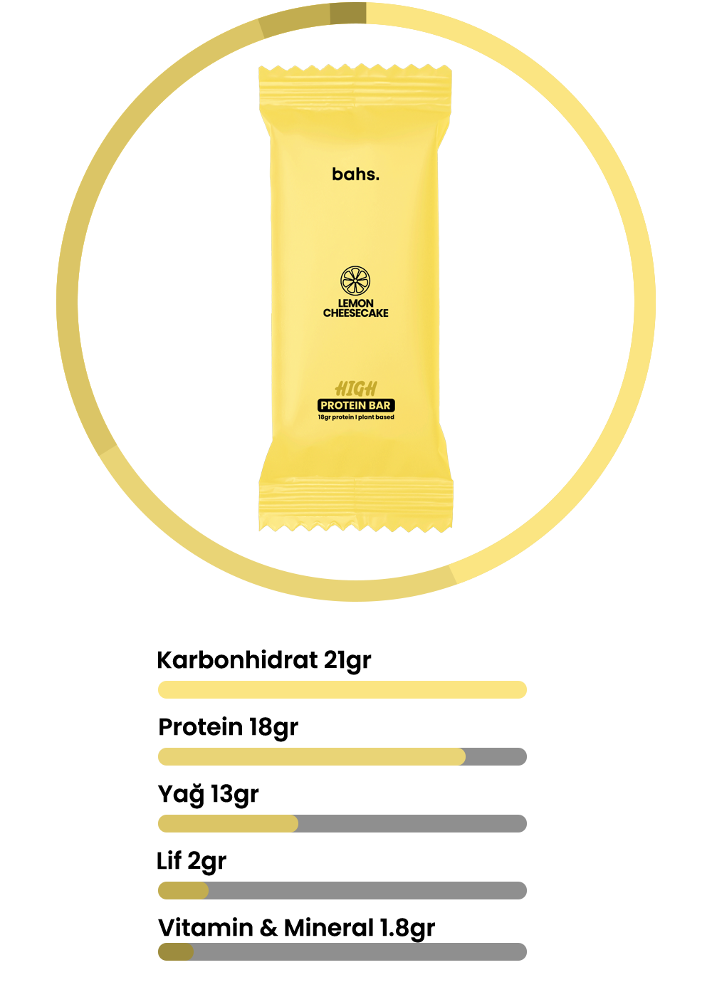 Lezzeti ve sağlığı harmanlayan bahs. Yüksek Protein Bar, yumuşak dokusu, 18 gr yüksek proteini, dengeli ve besleyici içeriği ile %100 bitki bazlı bir atıştırmalıktır.