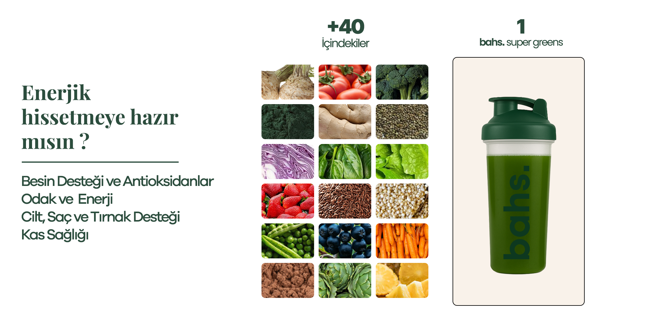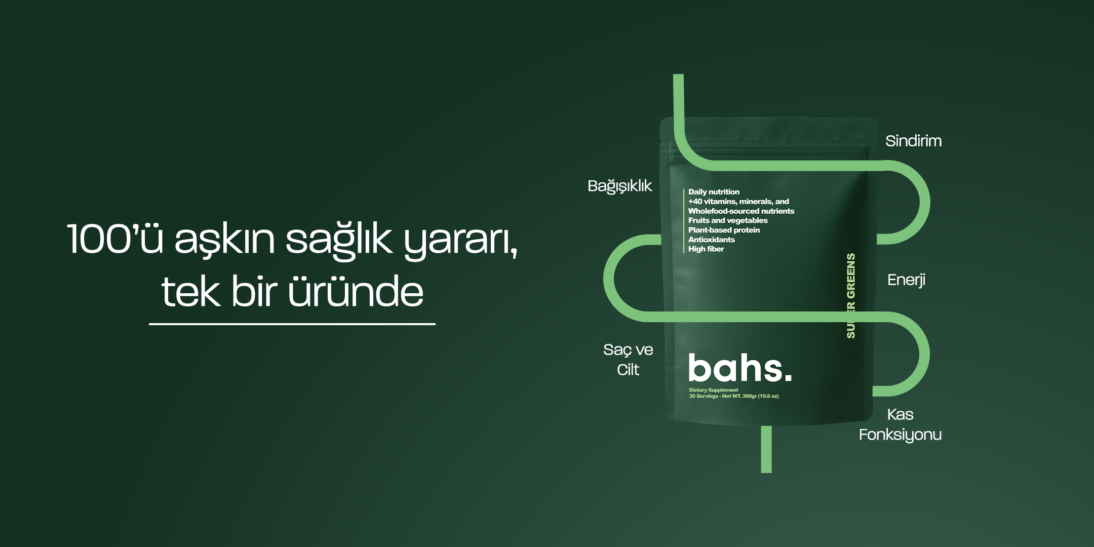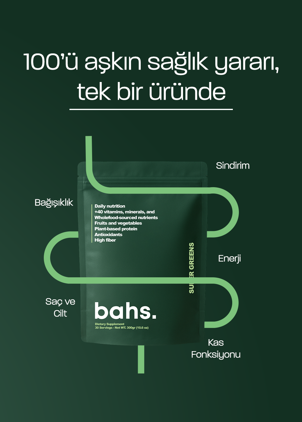 bahs. Super Greens, sadece bir takviye değil, günlük yaşamı kolaylaştıran, sindirimi destekleyen ve vücut fonksiyonlarını dengeleyen kapsamlı bir besin kaynağıdır